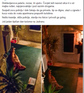 Naime, kako je napisao, susjedi su, zatečeni prizorom, odmah alarmirali policiju. Goli muškarac potom se dignuo s poda te je počeo kucati na vrata okolnih apartmana u kojem su odsjeli turisti. Ipak, u daljnjem egzibicionizmu spriječili su ga policijski službenici koji su, tvrdi čitatelj, uz uporabu lisica priveli gradskog nudistu.